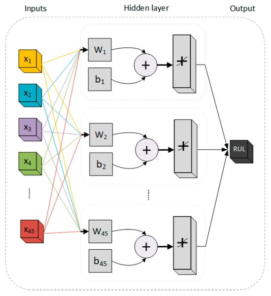Neural networks can be defined as a mathematical function that manipulates a set of derived inputs, commonly known as hidden nodes. The concealed nodes can be represented as non-linear transformations of the initial inputs. The researcher is provided with the choice to define how many hidden layers they prefer, where each layer can be customised to include any desired quantity of hidden nodes. The neural network architecture encompasses a fully connected multi-layer perceptron, consisting of either one or multiple layers. Neural networks are utilised in order to predict one or more response variables by employing a flexible function of the input variables. Neural networks demonstrate robust predictive ability in scenarios where there is no need to explicitly define the functional structure of the response surface or establish a clear description of the relationship between the input variables and the response variable [19]. Figure 2 displays the proposed neural network design that showcases 45 inputs derived from the dataset, with the only output being the prediction result for RUL.