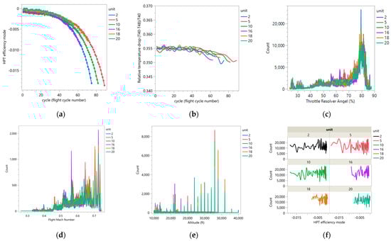 Interconnected relationships between scenario descriptors such as Mach number, throttle resolver angle (TRA), altitude (alt), and operative parameters such as fight cycles, HPT efficiency, total temperature, and its relative temperature drop. (a) Cycle versus HPT efficiency. (b) Cycle versus relative temperature drop. (c) Throttle resolver angel time series variations. (d) Engine Mach number variations. (e) Flight altitude changes. (f) Engines HPT efficiency variation against individual engine units.