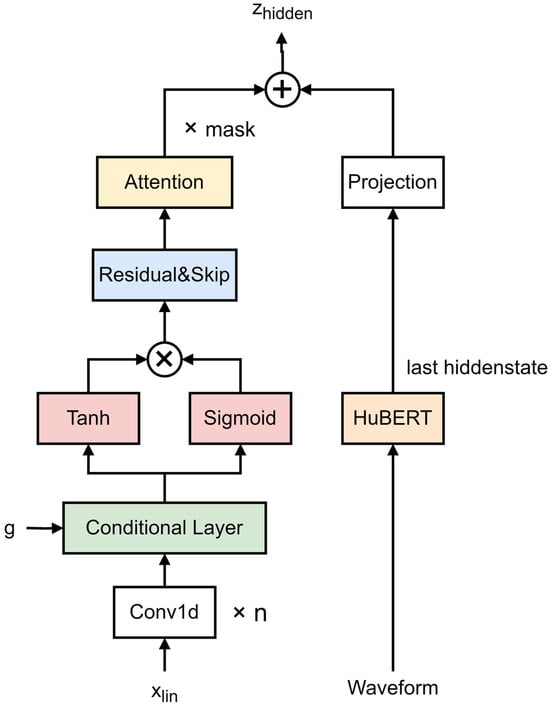 The original posterior encoder in VITS takes linear spectrogram input and possible conditional input and then performs forward propagation operations. Firstly, if there is a conditional input , it is processed through conditional layers. Then, for each layer, the input is convolved through input layers () and then processed through an activation function. After the activation function processing, residual connections and skip connections are added to the input and Dropout is applied. Finally, the outputs of all layers are summed and multiplied by the input mask ). Such posterior encoder structures tend to be relatively simple, lacking parallel information and failing to effectively extract features from various frequency bands of speech.