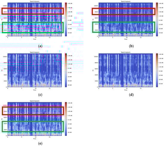 Visualization of the spectrograms by different models corresponding to the text “Printing, in the only sense with which we are at present concerned, differs from most if not from all the arts and crafts represented in the Exhibition”. (a) Ground Truth; (b) VITS-Baseline; (c) VITS-XPB; (d) VITS-Pseudo Phoneme (HuBERT); (e) BERRTIVITS.