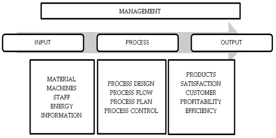 Management of the company must focus on input management, process management, and output management (Figure 1). Input management includes facilities, equipment, staff, suppliers, transport, material, energy, and information. Output management includes products, services, customer satisfaction, environmental impact, and sustainability of products and services. Management of processes includes all processes in the company through process flow, process design, process control, and process improvement [28].