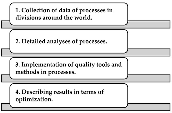 In this article, we deal with process optimization in the divisions of parent manufacturing companies around the world. We focus on the processes of supplying input resources, the storage process, the production process, and improvement with an emphasis on layout, the expedition process, and the environmental, social, technical, and economical maintenance of all processes. The purpose of this paper was to investigate the use of quality tools and methods in the 24 divisions of a mother company with geographical locations around the world, in the countries of America, Africa, Asia, and Europe. The aim of the research was to determine the applicability of the same quality tools and methods in business processes without regard to external factors. Our research took as its subject the 24 divisions of a manufacturing company that supplies automotive components for the automotive industry around the world—in America, Africa, Asia, and Europe (Figure 2). This company combines quality with innovation, which is the main pillar of Industry 4.0. At the same time, it is the main supplier of lighting, electronics, and driving units in the automotive sector.
