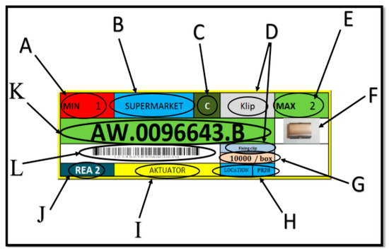 Kanban cards (Figure 6) contain all important information about material delivery via barcode. The Kanban card contains the following information: A—minimum quantity of components in the stack, B—place of occurrence of the component, C—class of the component, D—name of the component, E—maximum quantity in the stack, F—image of the component, G—value of the component, H—position of material in the warehouse, I—name of the product that the given component needs, J—production line for the component, K—number of the component in the SAP system, L—barcode/sensor.