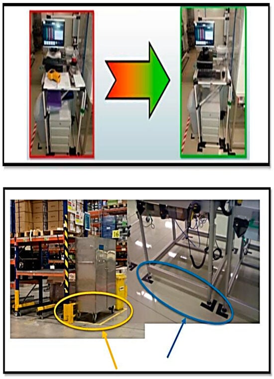 Figure 7 points out the removal of unnecessary items from the workplace to save space and mark space, the correct storage of tools (which reduces their loss), the localization of objects, the placement of frequently used tools near the point of use, the storage of a minimum amount of supplies, the marking of equipment for storage, and the marking of machines, which means increasing production efficiency. An important part of 5S is cleaning the workplace, determining the proper method of cleaning and areas for waste, marking waste, and setting cleanliness goals. The benefit was the improvement of working conditions for employees.