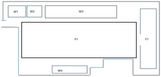 The layout of the workplace (Figure 8) presents the situation in the production hall before implementation of quality tools and methods. In this layout are parts of the production hall. W1—warehouse of material, W2—warehouse of spare parts, W3—warehouse of complete products, W4—warehouse of waste, P1—production area with machines and instruments, E1—packing and expedition of products.
