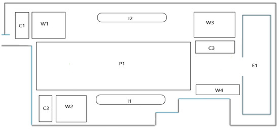 The changes in the production layout (Figure 9) resulted in the division of the production hall into zones that enable better material transport and employee transfers, the succession of individual activities within the production process, and the availability of support tools for the maintenance process. In this layout are parts of the production hall. C1—input inspection of material, W1—warehouse of material, I2—equipment for production, C2—inspection of spare parts, W2—warehouse of spare parts, I1—equipment for maintenance process, W3—warehouse of complete products, P1—production area with machines, W3—warehouse of complete products, C3—inspection of complete products, W4—warehouse of separated waste, E1—packing and expedition of products.