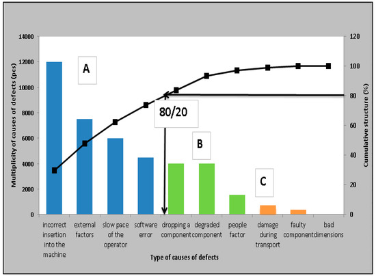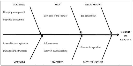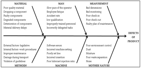An important goal of production is the reduction of defects. Therefore it was necessary to analyze the causes of defects and determine the “critical” causes that need to be eliminated or minimized in production. We solved this problem with the quality management tools of the Ishikawa diagram (Figure 11) and Pareto analysis. Pareto analysis will determine the 20% of critical causes associated with an 80% share of the number of defects.