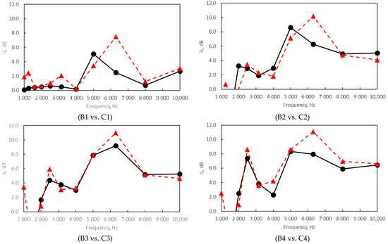 With configuration B1, the maximum attenuation is achieved at 5 kHz, equal to 5 dB, while with configuration C1, the maximum attenuation is shifted to 6.3 kHz, equal to 7 dB. A common factor between configurations B1 and C1 occurs across the other octaves, which is very comparable around 1 dB at frequencies below 4 kHz and has the same trendline at 10 kHz.