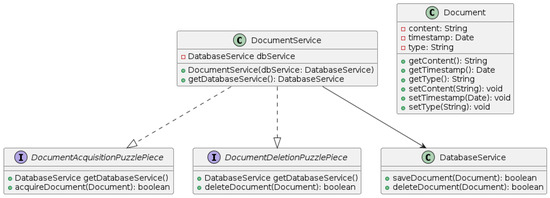 The implementation of the Document Management System using the Puzzle Pattern approach, as depicted in the provided UML diagram (Figure 1) and subsequent Java code 1 in Appendix A, offers a clear demonstration of how to architect software to promote modularity and loose coupling. By segregating different functionalities such as the acquisition and deletion of documents into separate interfaces, the system achieves a high level of modularity. This separation allows for distinct behaviors to be developed, tested, and maintained independently of one another, enhancing the system’s manageability and scalability. Implementing functionalities as interchangeable puzzle pieces (interfaces) enables easier adjustments and additions down the line. For instance, introducing a new operation, such as document modification, can be done by adding another interface and implementing it in the DocumentService class or a new class altogether without disrupting existing code. The design promotes reusability through interfaces. Different parts of the application can reuse the same interface for similar operations, or new projects can adopt the established interfaces, reducing the need to rewrite common functionality. The interfaces ensure that concrete implementations are loosely coupled, minimizing the impact of modifications on other parts of the system and easing maintenance.