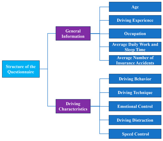 The survey on drivers’ driving characteristics was conducted through a questionnaire, which was structured into two parts (own compilation). The first part has eight questions, involving sociodemographic statistics and general information, including drivers’ age, driving experience, occupation, education, average number of insurance accidents per year, average daily sleep time, and average daily work time. The second part contains questions measuring driving characteristics, including driving behavior (four items), driving technique (four items), emotional control (four items), driving distraction (four items), and speed control (four items), with five latent variables and 20 observational variables. The Driving Characteristics Scale has a total score of 100. Details are shown in Figure 1.