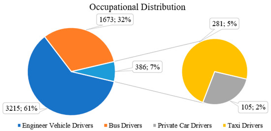 Figure 2 shows a schematic diagram of an engineering vehicle and a bus. Figure 3 shows the occupational distribution of drivers. From the total of 5274 valid data points, 3215 are drivers of engineering vehicles, accounting for 61%; 1673 are bus drivers, accounting for 32%; 281 are taxi drivers, accounting for 5%; 105 are private cars, accounting for 2%. Given that the samples of taxi and private car drivers are relatively small, the two sets of data have been merged into one group to be analyzed as “other vehicles”. After the merger, other vehicles contains 386 drivers, accounting for 7% of the total number of drivers. As this paper mainly studies the drivers of engineering vehicles, there are nearly 15,000 drivers registered in Shenzhen, and about 8000 drivers are active all year round. A simple random sampling method was adopted for the questionnaire in the city of Shenzhen. Each driver had the same probability of being investigated [18]. The effective sample size of this paper represents one third of the city, so it is sufficiently convincing [19].