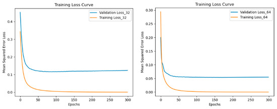 The numbers of neurons in the hidden layer of the model are set to 32 and 64 for the training and testing, respectively, and the loss value results are compared, as shown in Figure 6. This figure shows that the two models converge after 300 rounds of training. The figure on the left shows the training and testing results of 32 neurons, whose loss value is 0.123 on the test set. The figure on the right shows the training and testing results for 64 neurons, whose loss value on the test set is 0.0548. Thus, selecting 64 hidden layer neurons can achieve results close to the true value.