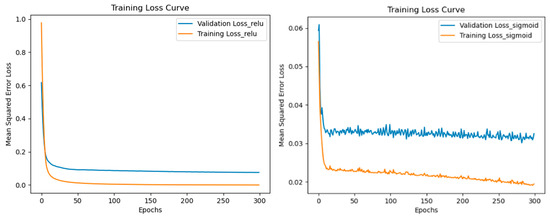 The results of the comparison experiment on the two activation functions are shown in Figure 7. The figure on the left shows the training and testing results of using ReLU as the activation function and a loss value of the test set as 0.102. The figure on the right shows the training and testing results derived when using sigmoid as the activation function and a loss value of 0.0326. This finding indicates that using sigmoid as the activation function is advantageous in terms of the loss value. However, the model’s fitting stability indicates that the convergence effect of this loss function must be optimized, and the test set fluctuates greatly, indicating an overfitting. Therefore, regularization comparison experiments are added to the next set of experiments to enhance model optimization.