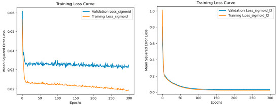 The comparison of the original training results with the results after performing L2 regularization is shown in Figure 8. With reference to the previous results of each hyperparameter’s optimization, the figure on the left shows the training and testing results using 64 neurons and sigmoid as the activation function. Moreover, the loss value on the testing set is 0.0326. The figure on the right shows the training and testing results with the addition of L2 regularization. The loss on its training set is 0.0331. The model converges well and can achieve a low test loss with the addition of L2 regularization.