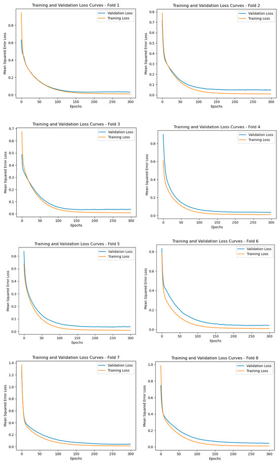 On the basis of the above optimization results, this study finally adopts 64 as the number of neurons in the hidden layer, sigmoid as the activation function, and L2 regularization in the relevant settings of the training parameters. Moreover, the network training optimization algorithm adopted is Adam. The initial learning rate is set to 0.01, the number of training rounds is 300, and the batch size is 16. Given the number of datasets, this study adopts the K-fold cross-validation method for training, and 8-fold cross-validation is trained and tested on the training set. The results are shown in Figure 9 and Table 5.