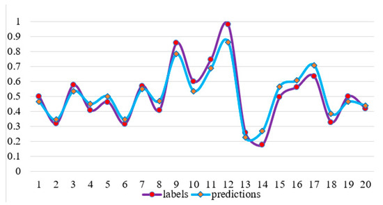 A total of 20 sets of sample data are selected to test the model’s generalization ability. The real samples and network output values are shown in Figure 10, with a loss value of 0.330 on the test set. The visualization of the prediction results in relation to the true values indicates that the output of this evaluation model has a high degree of fitting accuracy with the real samples.