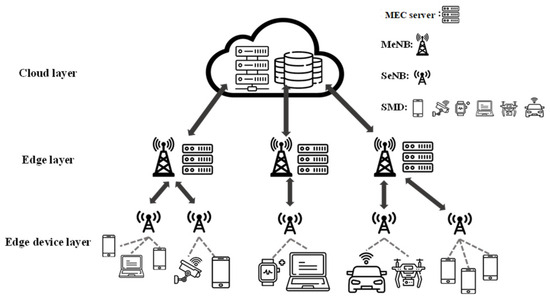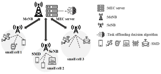 This study adopts the framework proposed in reference [2], which includes mobile edge computing (MEC) servers and Macro eNodeBs (MeNBs). MeNBs connect to multiple Small eNodeBs (SeNBs), as illustrated in Figure 2. SeNBs are divided and interconnected based on the location of Smart Mobile Devices (SMDs), facilitating task transmission. In this architecture, computational capabilities are exclusive to edge servers and smart devices. The configuration comprises one edge server, MeNB collectively, M SeNBs, and S SMDs.