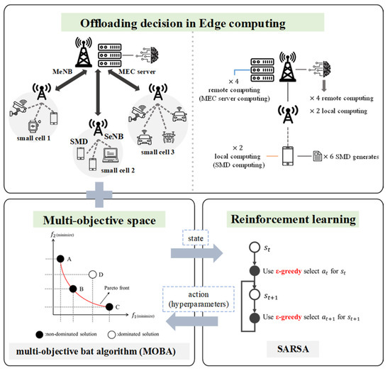 This study introduces MOBA-CV-SARSA, aiming to optimize task-offloading decisions for achieving equilibrium between network latency and energy consumption, as depicted in Figure 6. It preserves the bat algorithm’s framework while elevating it to a multi-objective bat algorithm using non-dominated sorting and crowding distance. Additionally, it incorporates SARSA with reinforcement learning to autonomously fine-tune the multi-objective bat algorithm’s hyperparameters and offers multi-objective decision making for thorough solution comparisons. This decision will evaluate the bat population’s rank first and then the crowding distance [14] if the bats have the same rank in each iteration. Post-iteration sorting is conducted based on energy consumption to extend the network’s longevity. Bats with smaller energy expenditures will be prioritized. This is because this paper hopes to extend the life of the network and does not want the device to fail prematurely due to insufficient power. Therefore, this decision is included before outputting the final result. That is, if bats at the same level have the same crowding distance at the same time, they will be sorted according to energy consumption in the final optimized population.