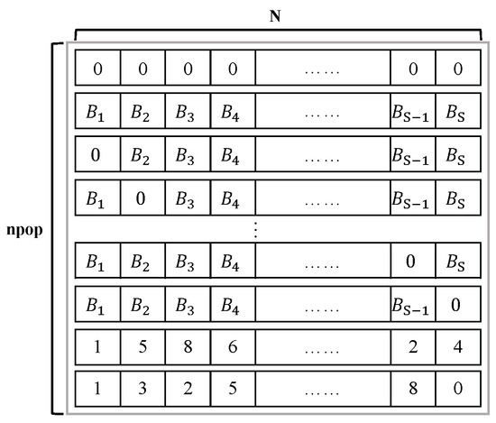 Initially, Figure 6 delineates the population’s initialization settings [2]. Each row symbolizes a bat (,), with N indicating the bat’s dimensionality, equivalent to the overall count of smart devices (S). The total population consists of npop rows, signifying the aggregate number of bats. Each bat encapsulates task-offloading decisions across dimensions. The first bat performs local computation for all device tasks, whereas the second conducts remote computation. reflects the outcome following the conversion of all functions of the sth device to remote computation, as defined by Equation (1).