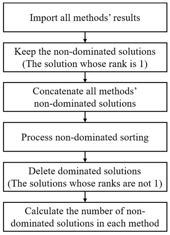 This study utilizes non-dominated sorting [14] to assess the Pareto solution sets generated by different methods. The process is delineated in Figure 9. All Pareto solution sets from each technique are initially collected, and non-dominated solutions are preserved. Subsequently, the non-dominated solutions across all methods are amalgamated, uniquely identifying each method’s solutions. Then, all solutions undergo non-dominated sorting. After sorting, each solution receives a rank, and those not at rank 1 are removed, leaving only dominant solutions. Finally, the quantity of retained non-dominated solutions per method is determined based on their assigned numbers.