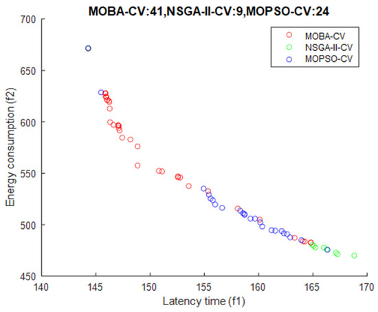 Table 7 displays the outcomes of the optimal solutions identified by three methods concerning total network energy consumption and latency. Latency and energy consumption represent conflicting objectives; however, when latency is constrained within acceptable limits, MOBA-CV achieves reductions of 77.543 W and 34.722 W in energy consumption compared to NSGA-II-CV and MOPSO-CV, respectively. These results unmistakably indicate MOBA-CV’s capability to attain a more harmonized solution amidst such trade-off dilemmas. Additionally, Table 8 outlines the mean computation time for each approach. MOBA-CV exhibits computations of 3.562 s and 642.416 s, making it swifter than NSGA-II-CV and MOPSO-CV, respectively. Given the context of edge computing, shorter computation time aligns better with optimizing task-offloading determinations in this domain. In Figure 10, we can clearly observe the comparison results after non-dominated sorting. MOBA-CV retains 41 non-dominated solutions, and NSGA-II-CV and MOPSO-CV have 9 and 24 solutions, respectively. Obviously, MOBA-CV not only obtains the largest number of non-dominated solutions, but more importantly, these solutions achieve a balance between delay time and energy consumption. These solutions are mainly concentrated in the center of the graph. In comparison, the solutions obtained by other comparison methods are mainly concentrated in the upper left and lower right corners. This means that although these solutions optimize one objective, they sacrifice performance for another objective.