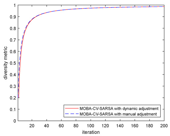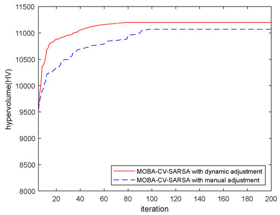 MOBA-CV-SARSA-DA employs two distinct strategies: (1) a total of 200 iterations for both fixed-range and small-range searches, and (2) 100 iterations for fixed-range searches combined with the same for small-range searches, resulting in a total of fewer than 200 iterations. Our analysis of the results reveals that when the total iteration count reaches 200, MOBA-CV-SARSA-DA exhibits a 0.095% enhancement in the hypervolume indicator compared to MOBA-CV-SARSA-MA. Moreover, MOBA-CV-SARSA-DA achieves performance akin to MOBA-CV-SARSA-MA without necessitating the completion of 200 iterations. In Table 15, MOBA-CV-SARSA with a fixed range showcases the most favorable diversity metric. Its broader search range provides increased flexibility in adjusting solutions, facilitating the exploration of a more comprehensive array of solutions.