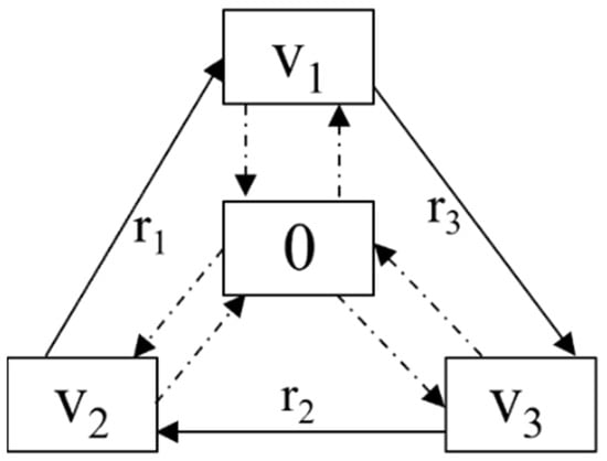 If there are k routes (r1, r2, …, rk) in the SDVRP, for k customer points (v1, v2, …, vk), if rm contains vm, vm+1 (m = 1, 2, …, k − 1) and rk contains v1, vk, it is called a k-split cycle. Figure 1 shows a 3-split cycle.