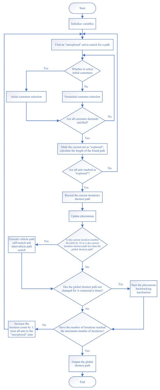 The structure of this article is organized as follows. Section 2 introduces the related literature of the SDVRP. Section 3 introduces the mathematical model of the SDVRP. Section 4 presents our proposed improved ant colony algorithm in detail. In Section 5, we apply the improved ant colony algorithm proposed in this paper to small-scale, medium-scale and large-scale test sets, and then discuss the experimental results. Finally, Section 6 summarizes this paper.