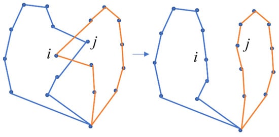 In the current iterative best solution, customers on the path of each vehicle are exchanged in pairs. After the exchange, there is no need to review the carrying capacity because the vehicle carrying capacity has been reviewed in the vehicle path search, and the overall carrying capacity will be unaffected by the order of the exchanged customer points. After the exchange, the new path length is calculated. If the length is less than the current best solution, the best solution will be replaced by the currently found solution. The detailed steps of the algorithm can be seen in Algorithm 1.