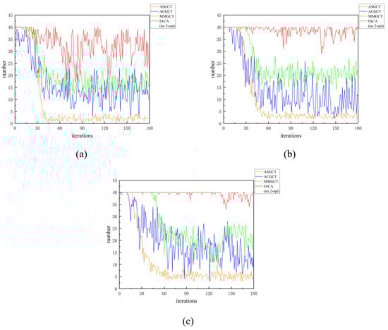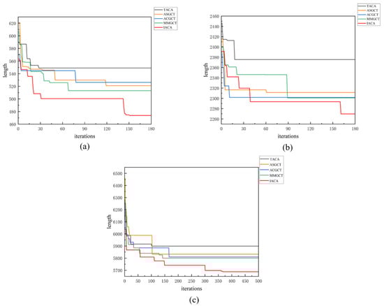 As shown in Figure 6, the initial solution found by the IACA is of high quality. In Figure 6a,c, the initial solution of the IACA is superior to other algorithms. In Figure 6b, the initial solution of the IACA is similar to the ACGCT and better than the remaining algorithms. This indicates that the proposed initial pheromone distribution method based on a greedy strategy in this paper is effective. With the guidance of pheromones, ants can find higher quality initial solutions. From Figure 6, it can also be observed that the IACA achieves a better balance between convergence speed and global search ability. Compared to other algorithms, the IACA can converge to better solutions. This indicates that the proposed adaptive threshold selection can better adapt to different stages of the ant colony search process, thereby achieving a better balance between convergence speed and global search ability of the algorithm. In addition, as the number of iterations increases, the positive feedback mechanism of the pheromone leads to the accumulation of a large amount of pheromone on the current optimal path, causing these algorithms to gradually become trapped in local optima. Due to the use of the pheromone backtracking mechanism and the adaptive pheromone volatile factor during the pheromone handling stage, the IACA exhibits a stronger ability to escape from local optima. Even in the middle and late stages of the algorithm, the IACA can still jump out of the local optimum. In Figure 6a, the IACA jumps out of the local optimal value when the algorithm iterates approximately 150 times, and in Figure 6b, the IACA jumps out of the local optimal value when the algorithm iterates approximately 160 times. In Figure 6c, the IACA can still find a better solution after almost 360 iterations.