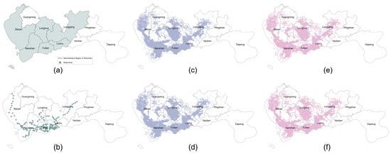 Metro station data: The metro stations opened for operation in Shenzhen in 2018 can be found at https://www.szmc.net (accessed on 10 November 2023). The metro station data are obtained through the API of AMAP (a map application, https://www.amap.com/, (accessed on 10 November 2023)), and the spatial distribution of metro stations is shown in Figure 1b.