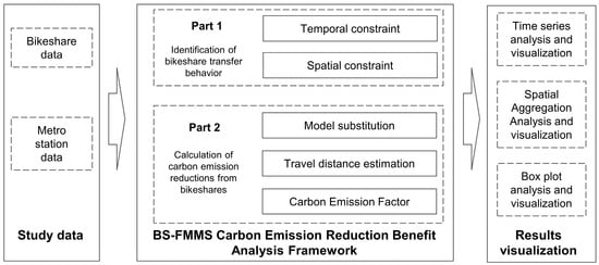 This section first proposes a framework for analyzing the carbon emission reduction benefits of BS-FMMS and then proposes a spatiotemporal visualization method for the carbon emission reduction benefits of BS-FMMS. The framework of the methods is shown in Figure 2.