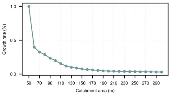 Spatial constraint: There is no standardization in the size of the metro station transfer range between different cities in the existing studies [,,,]. Differences exist in the frequency of bikeshare transfer use in different cities, and the spatial characteristics of the city also affect the traveler’s choice of transport mode. Based on the existing research [], the actual travel data of bikeshare in Shenzhen were used to establish the radius of the metro station transfer range, ranging from 50 m to 300 m. Within this range, the amount of bikeshare ridership was counted every 10 m, and the growth rate of the ridership between neighboring transfer ranges was calculated. A line graph was then plotted, and the value corresponding to the turning point, where the growth rate changes from a steep increase to a flat increase, was taken as the radius of the metro station transfer range. The growth rate of gi of the bikeshare ridership in the i-th catchment area is calculated as follows:
