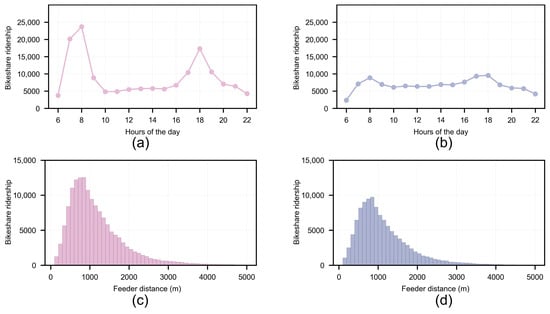 After the selection of spatiotemporal constraints, the bikeshare feeder volume on workdays and non-workdays is obtained, as shown in Figure 4a,b. The bikeshare feeder volume on the workday has obvious morning and evening peaks from 7:00 to 9:00 and 17:00 to 19:00, while the bikeshare feeder volume on the non-workday reaches the morning and evening peaks at the same time, but the peaks are not obvious.
