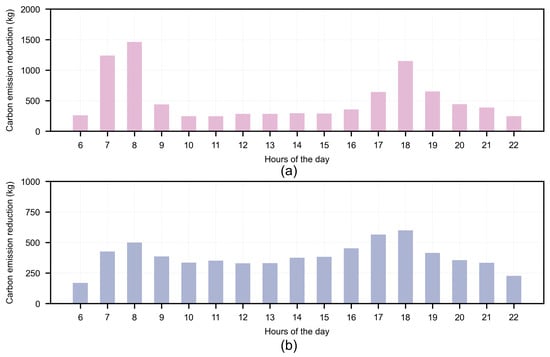 Temporal distribution of carbon reduction benefits of BS-FMMS on workdays and non-workdays. (a) represents the workday and (b) represents the non-workday.