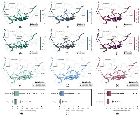 Spatial distribution of carbon reduction benefits of BS-FMMS on workdays and non-workdays. From top to bottom, it shows the spatial distribution of workday, the spatial distribution of non-workday, the spatial distribution of the difference between workday and non-workday (type 1 is that the carbon emission reduction on workday is larger than that on non-workday, and type 2 is that the carbon emission reduction on workday is smaller than that on non-workday), and the distribution of the box plots within the same period. From left to right, these are the all-day period (6:30 to 23:00), the morning peak period (7:00 to 9:00), and the evening peak period (17:00 to 19:00). (a,e,i) show the spatial distribution of carbon emission reductions during the all-day period, the morning peak period, and the evening peak period on workdays, respectively. (b,f,j) represent the spatial distribution of carbon emission reductions during the all-day period, the morning peak period, and the evening peak period on non-workdays, respectively. (c,g,k) show the spatial distribution of the difference in carbon emission reductions between workdays and non-workdays in the all-day period, the morning peak period, and the evening peak period, respectively. (d,h,l) represent the box plots distribution of carbon emission reductions between workdays and non-workdays in the all-day period, the morning peak period, and the evening peak period, respectively.