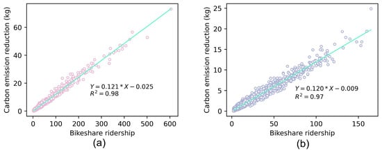 The ridership and carbon emission reductions from BS-FMMS were aggregated in hourly time panes and spatially scaled in the metro station area, respectively. The scatter plot of ridership and carbon emission reduction is plotted and fitted, as shown in Figure 7. It is seen that the R2 values for the workday and non-workday fits are 0.98 (see Figure 7a) and 0.97 (see Figure 7b), respectively.