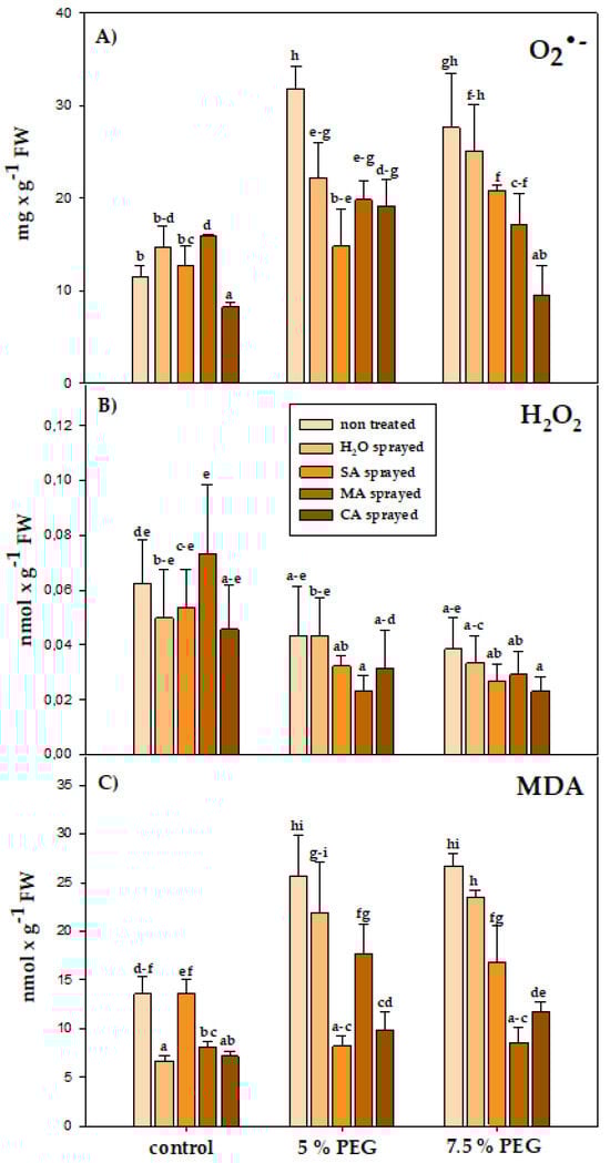 Effect of foliar application of salicylic acid (SA), maleic acid (MA), and citric acid (CA) on selected physiological parameters: (A) superoxide anion radical, (B) H2O2, (C) MDA. Values with the same letter do not differ significantly at p 0.05.