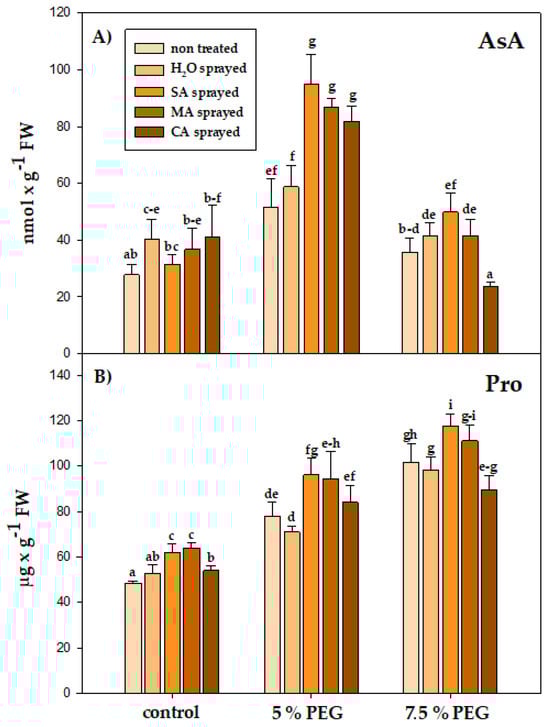 Moreover, a significant increase in the accumulation of proline (Pro) and ascorbic acid (AsA) was also recorded under drought stress. The application of exogenous acids significantly increased the accumulation of both Pro and AsA under stress and control conditions (Figure 2). The osmolyte accumulation (Pro) was higher under the stronger stress (7.5% PEG), in contrast to the AsA level, which was higher under 5% PGE. SA resulted in a greater increase between the three acid treatments than MA and CA. The AsA levels were, respectively, 1.8-fold (SA) and 1.5-fold (MA and CA) higher than in non-treated stress conditions. Positive correlations were found between proline content and all antioxidants (AsA, Phe, Fla, and Car) (Table S10). These results were statistically significant, as evidenced by p < 0.05. The content of Pro and AsA depended on the water stress level (PEG level) and various foliar sprays (Table S9).
