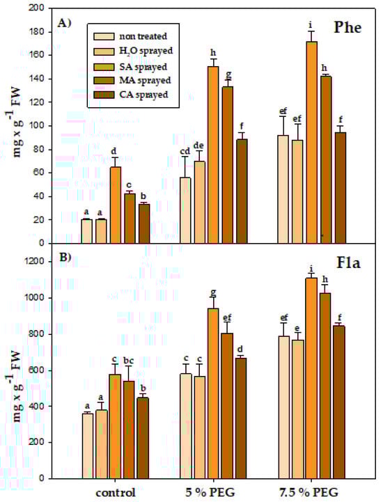 In addition, stress conditions significantly increased the pool of phenolic compounds (TFC), including flavonols (Fla). The TPC and Fla levels were, respectively, 2.8-fold and 1.5-fold (in 5% PEG) and 4.5-fold and 2.0-fold (in 7.5% PEG) higher (Figure 3). Acid foliar spray significantly increased parameter content under both drought and control conditions. SA was most effective in increasing its contents, whereas CA was the least effective. In the plants sprayed with SA, the level of TPC increased three-fold at 5% PEG and twice at 7.5% PEG. Positive correlations were found between phenolic compounds and flavonol content (Table S10). These results were statistically significant, as evidenced by p < 0.05. Positive correlations were also found between both Phe and Fla and superoxide anion, MDA, and total chlorophyll but were statistically insignificant (p > 0.05). The content of Phe and Fla depended on the water stress level (PEG level) and various foliar sprays (Table S9).