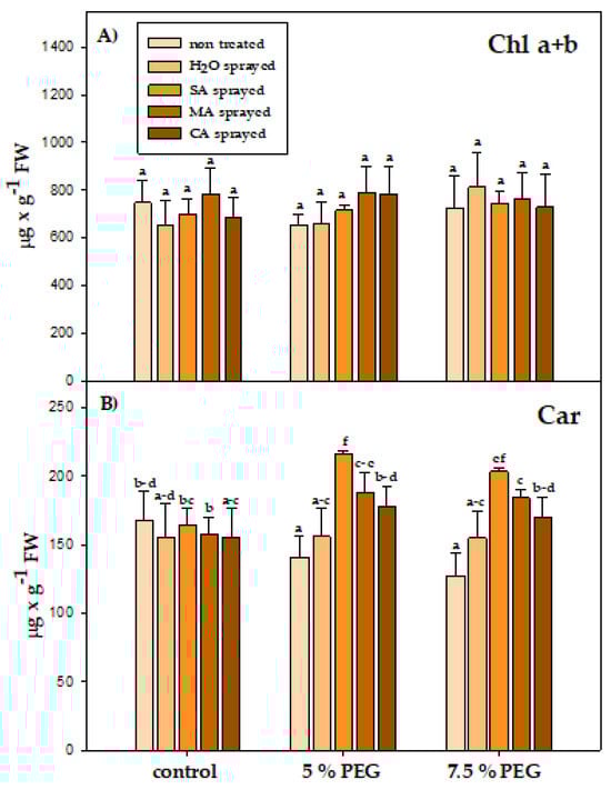 Effect of foliar application of salicylic acid (SA), maleic acid (MA), and citric acid (CA) on selected physiological parameters: (A) total chlorophyll, (B) carotenoid contents. Values with the same letter do not differ significantly at p 0.05.