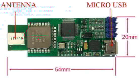 The D-DWM-PG1.7 UWB board, as illustrated in Figure 1, is produced by Lenet Technology Co., Ltd., situated in Guangzhou, China. This board is developed utilizing the DW1000 positioning chip, a product of Decawave Ltd., which is headquartered in Dublin, Ireland.. Its main technical specification is listed in Table 1. The distance between a pair of such modules can be ascertained with an accuracy of ±10 cm by measuring signal propagation time. This is achieved by employing two-way ranging utilizing time-of-flight (TOF) or one-way ranging using the time difference of arrival (TDOA) method. Based on the principle of distance intersection, the three-dimensional coordinates of a tag can be determined with an accuracy of ±30 cm.