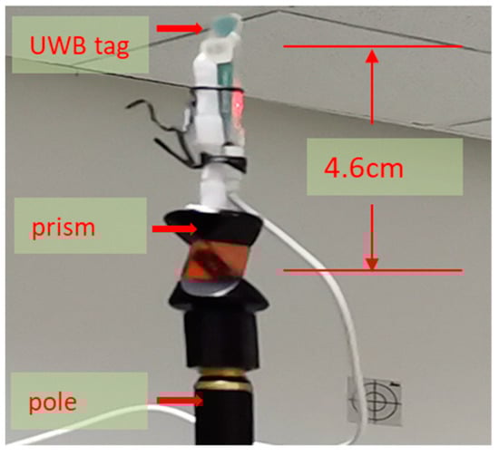 The structure diagram of the moving target, whose coordinates can be observed by the UWB and the RTS synchronously. The vertical offset between the UWB antenna and the center of the prism is 4.7 cm, which is used to convert the z coordinate observed by the RTS from the prism center to the UWB tag.