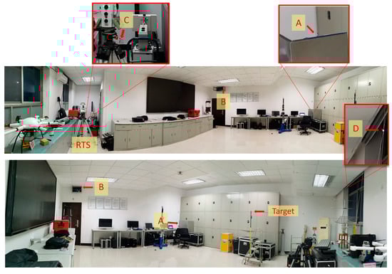 The panorama view of the experimental scene. A, B, C, and D each denote a distinct UWB base station.