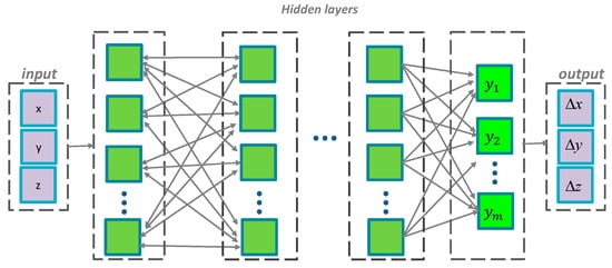 The neural network gains its name from its brain-like structure, composed of the input, hidden, and output layers. In this study, we designed two kinds of neural networks, i.e., the combined and separate networks, depending on whether the three coordinate components x, y, and z use the same neural network. As can be seen in Figure 6, for the combined network, there are three outputs () in the output layer. While for the separate ones, each network has only one output (one of , , and . The detailed parameters of each network’s structure are listed in Table 4. The training function is the Bayesian Regularization, which can train the network by optimizing the Levenberg–Marquardt algorithm by updating the bias and weights. It minimizes a combination of squared errors and weights, and then determines the correct combination to produce a network that generalizes well. The mean squared normalized error performance function was used as the performance function.