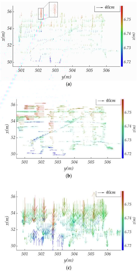 The arrow diagram of UWB positioning errors on three axes. The color of an arrow or a UWB station indicates its z value. The arrow is only drawn for every ten errors to avoid mutual obstruction. (a) UWB positioning error in the x component; (b) UWB positioning error in the y component; (c) UWB positioning error in the z component.