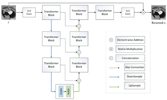 The framework of the Restormer denoising model. The Restormer showcases a multiscale hierarchical design integrating efficient Transformer blocks, meticulously crafted to maximize performance. The pivotal constituents of these Transformer blocks are MDTA, which fosters enriched query–key feature interactions across channels instead of spatial dimensions, thereby augmenting the depth of feature processing, and GDFN, which orchestrates controlled feature transformation, enabling seamless propagation of crucial information through the network layers.