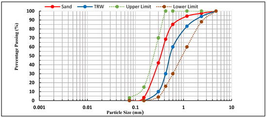 Particle size distribution of TRW and sand.