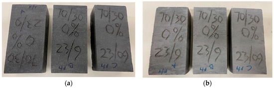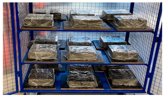 - After 48 h, the bricks were de-molded, sprayed with water, and wrapped with nylon film to enhance moist curing in an environment with an average humidity of 79% (±5%) and an average temperature of 19 °C (±5 °C), as shown in Figure 2.