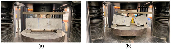 The samples that were cured for 7, 14, and 28 days were set up as shown in Figure 3 a,b and tested according to codes [51]. The loading rollers were brought into contact with the top of the brick sample, and then a seating load that did not exceed 100 N was applied to the brick sample. The uniformity of the bearing of the rollers was checked, and their positions were marked on the sides of the bricks, as shown in Figure 3, before proceeding with the loading.
